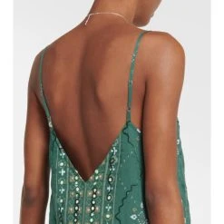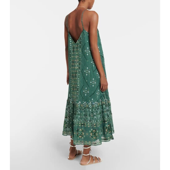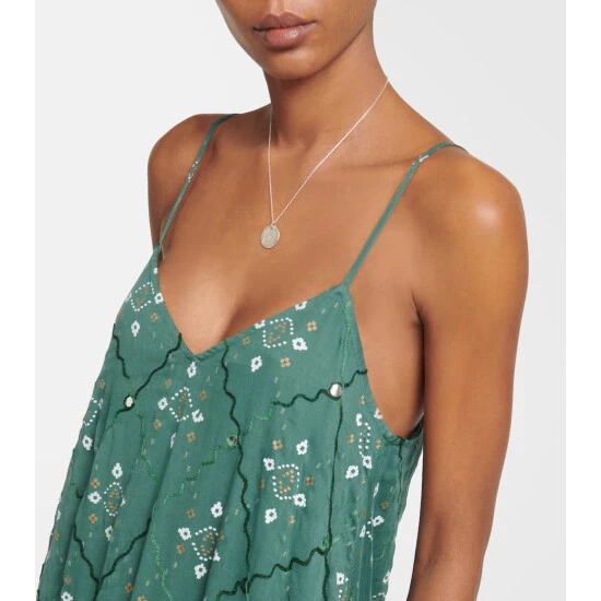 Made from pure cotton with a geometric print, this midi dress from Juliet Dunn has narrow shoulder straps, a tiered silhouette, and tiny mirrors embroidered all-over.
