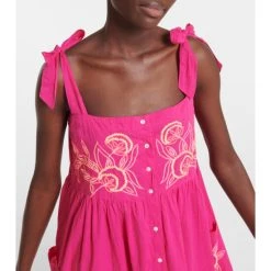 London-based designer Juliet Dunn employs Indian artisans to apply traditional techniques such as block printing, mirror work, and embroidery to her designs. This languid cotton minidress is detailed with floral embroidery and self-tie shoulder straps.