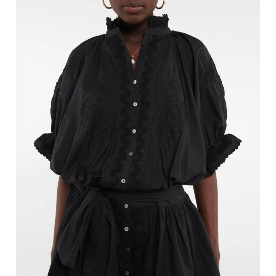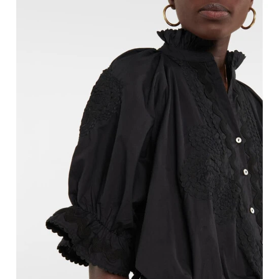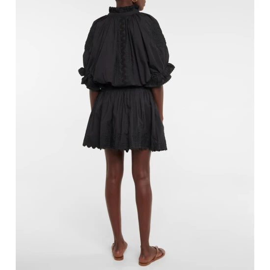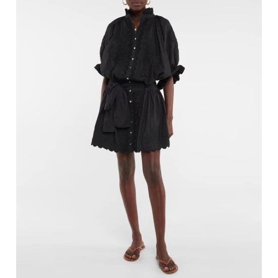 Your vacation edit is not complete without this black cotton mini dress from Juliet Dunn. It’s finished with charming scalloped trims and intricate embroidery as well as a self-tie belt which accentuates the soft billowing feel.
