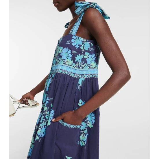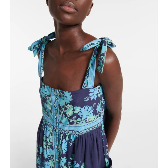 London-based designer Juliet Dunn employs Indian artisans to apply traditional techniques such as block printing, mirror work, and embroidery to her designs. This languid cotton minidress is detailed with a floral print and self-tie shoulder straps.