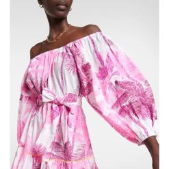 London-based designer Juliet Dunn employs Indian artisans to apply traditional techniques such as block printing, mirror work, and embroidery to her designs. This off-shoulder cotton minidress appears in a characterful floral print with piped borders.