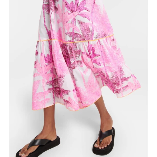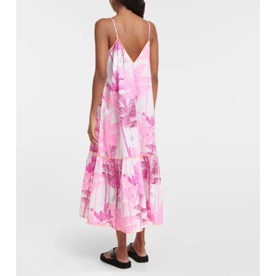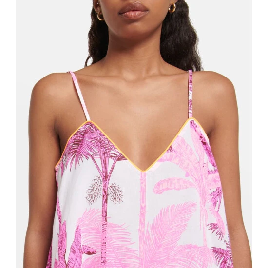 London-based designer Juliet Dunn employs Indian artisans to apply traditional techniques such as block printing, mirror work, and embroidery to her designs. This botanical cotton midi dress features a slip-inspired silhouette with contrast piping.