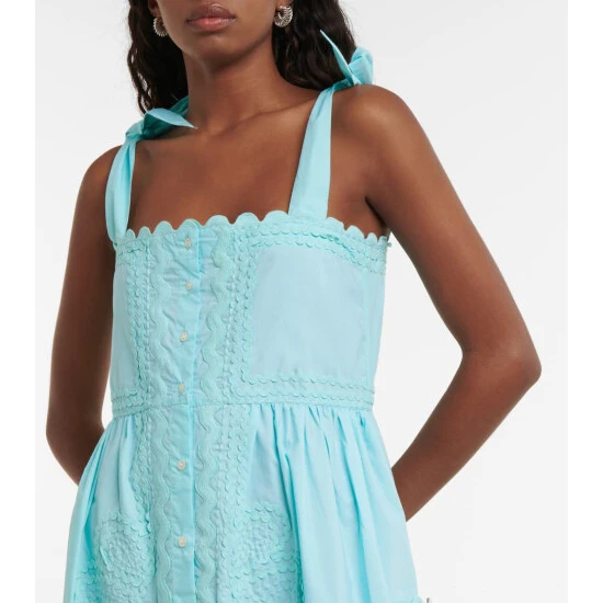 Summer getaway looks will be easy in this midi dress from Juliet Dunn. It’s cut from lightweight blue cotton poplin that’s adorned with scalloped trims throughout, and adjusts to fit via self-tie shoulder straps.