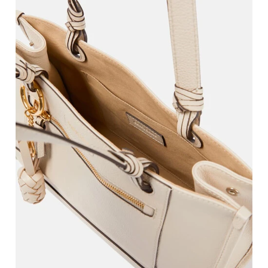 See By Chloé’s Cecilya Medium tote will size from desk-to-dinner. The capacious style is made from pebbled leather with artisanal knotted handles and a detachable braided pineapple keychain.