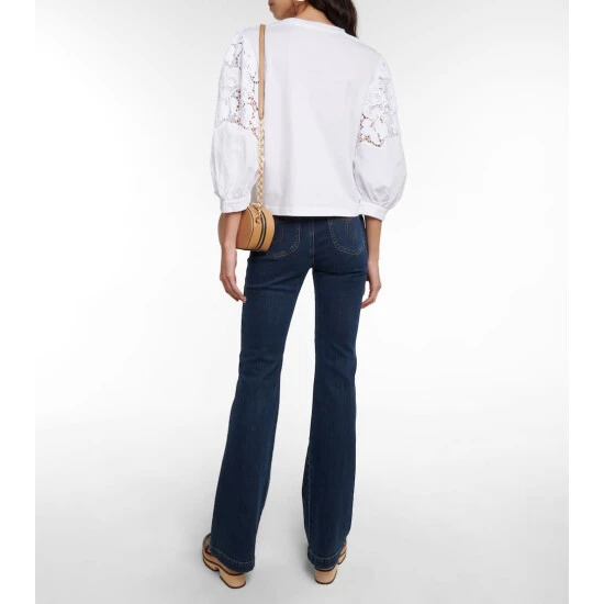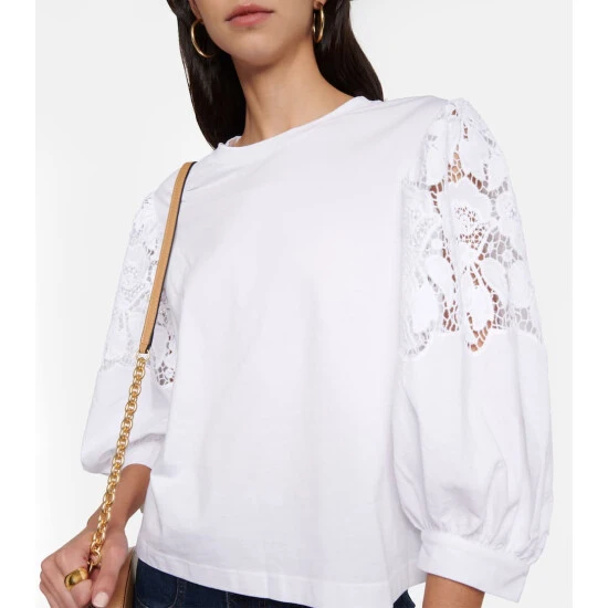 This top from See By Chloé is paneled with Guipure lace at the sides for a romantic finishing touch. It’s made from organically grown cotton jersey and has ruched sleeves.