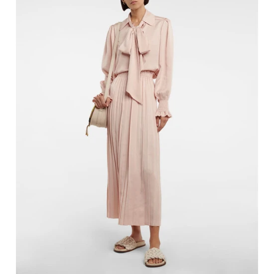 This ’70s-inspired blouse from See By Chloé has an elegant lavallière neckline. It’s made from lightweight fabric with a slight sheen and finished with smocked frilled cuffs. Pair with the matching maxi skirt.